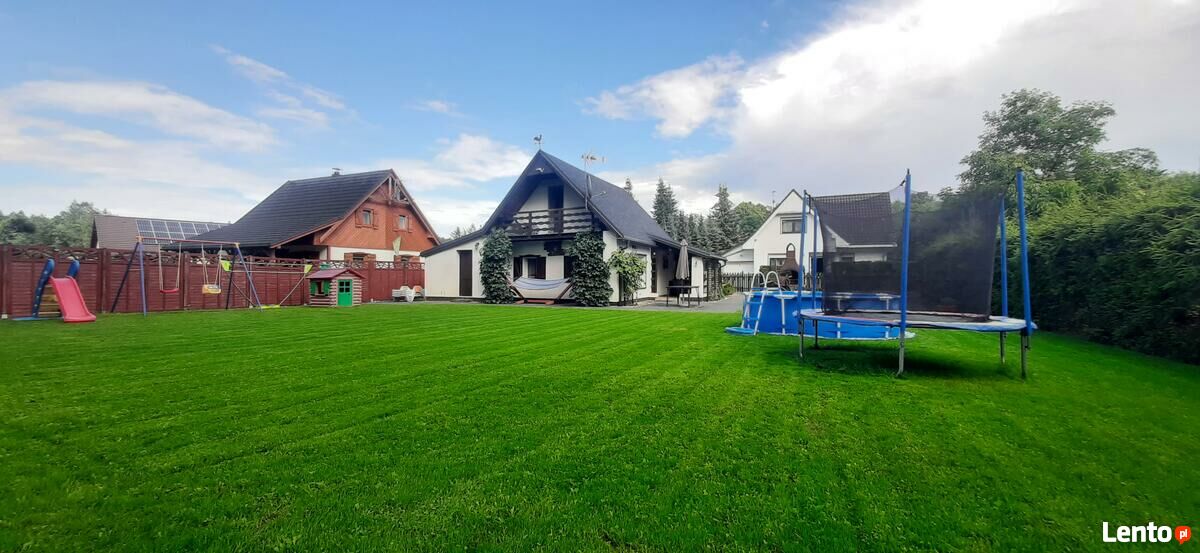 Sprzęt do zabawy dla dzieci.: domek, piaskownica, huśtawki, trampolina, zjeżdżalnia, basen ogrodowy o średnicy 305cm (w okresie lipiec, sierpień)